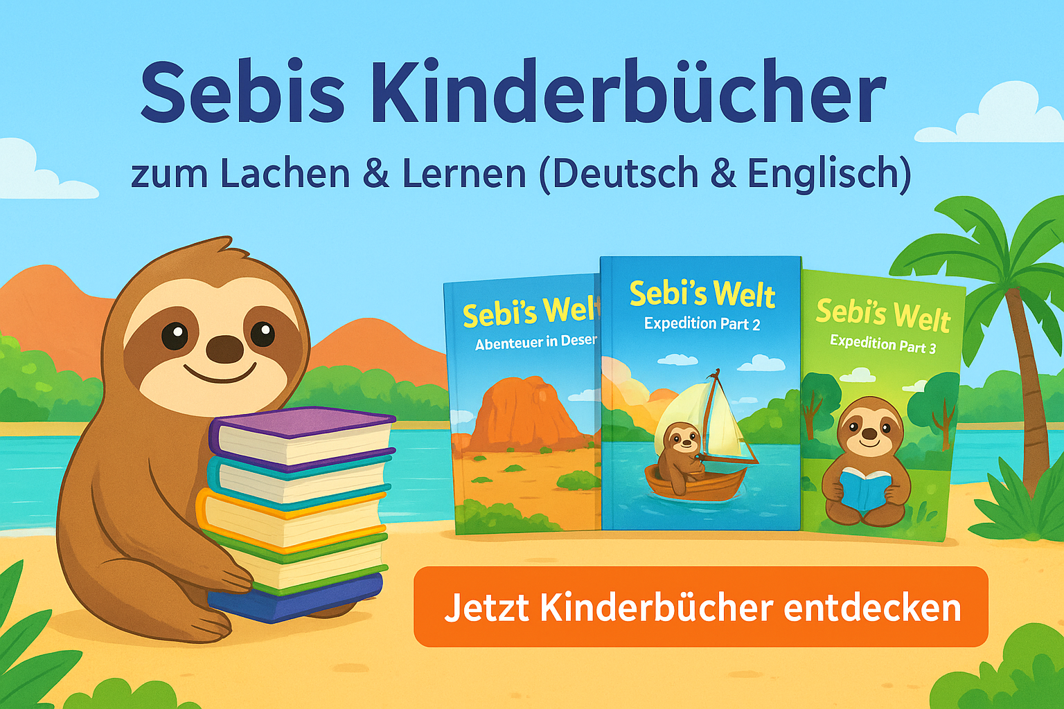 Lustige Abenteuer mit Sebi dem Faultier und seinen tierischen Freunden in Deutsch oder Englisch.