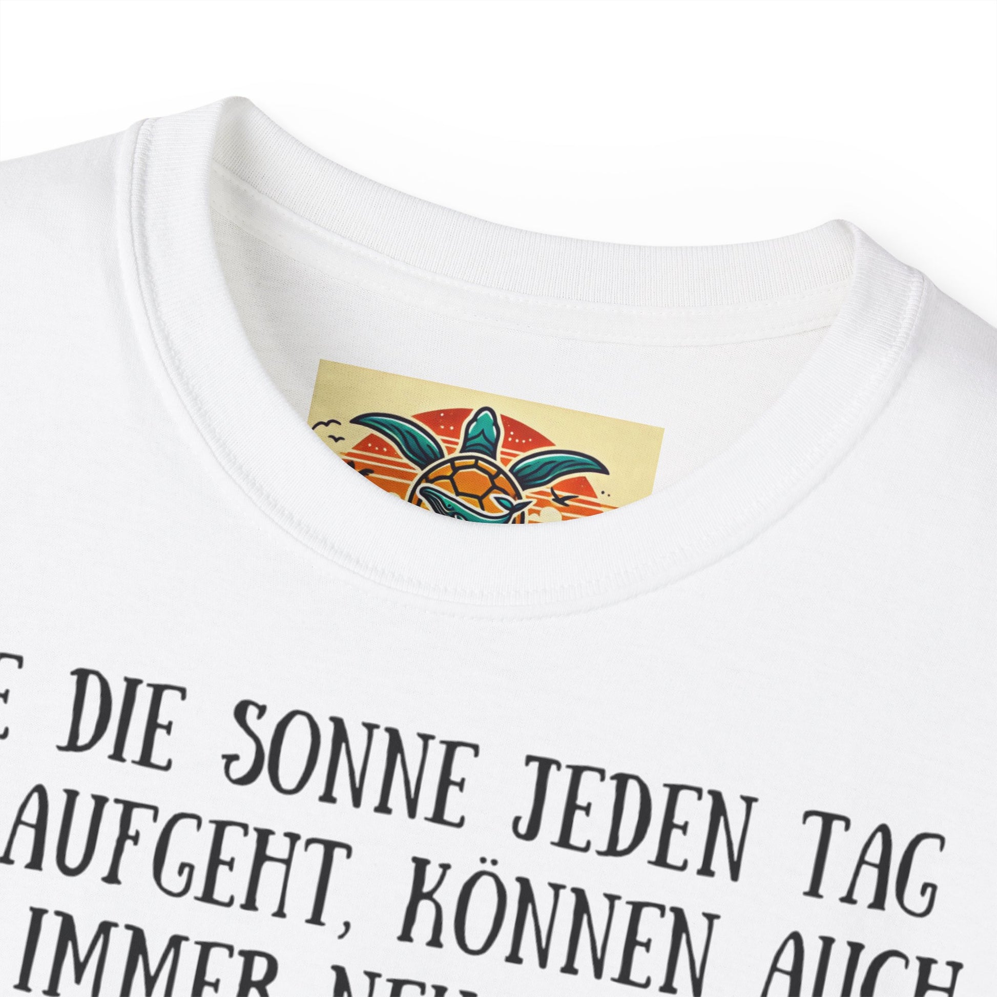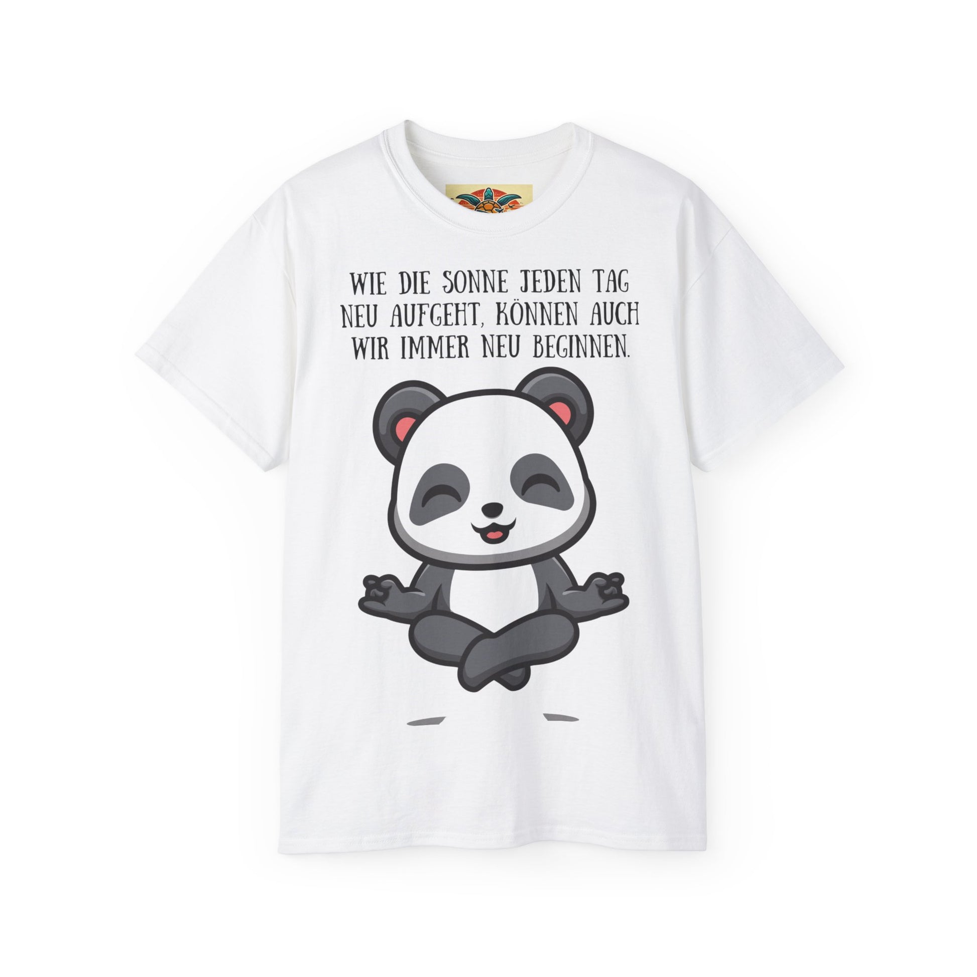 Dieser liebevoll gestaltete Panda im Cartoon-Stil erinnert uns daran, dass jeder Tag eine neue Chance ist. Mit dem Spruch „Wie die Sonne jeden Tag neu aufgeht, können auch wir immer neu beginnen“ vermittelt das Shirt Hoffnung, Gelassenheit und positive Energie.