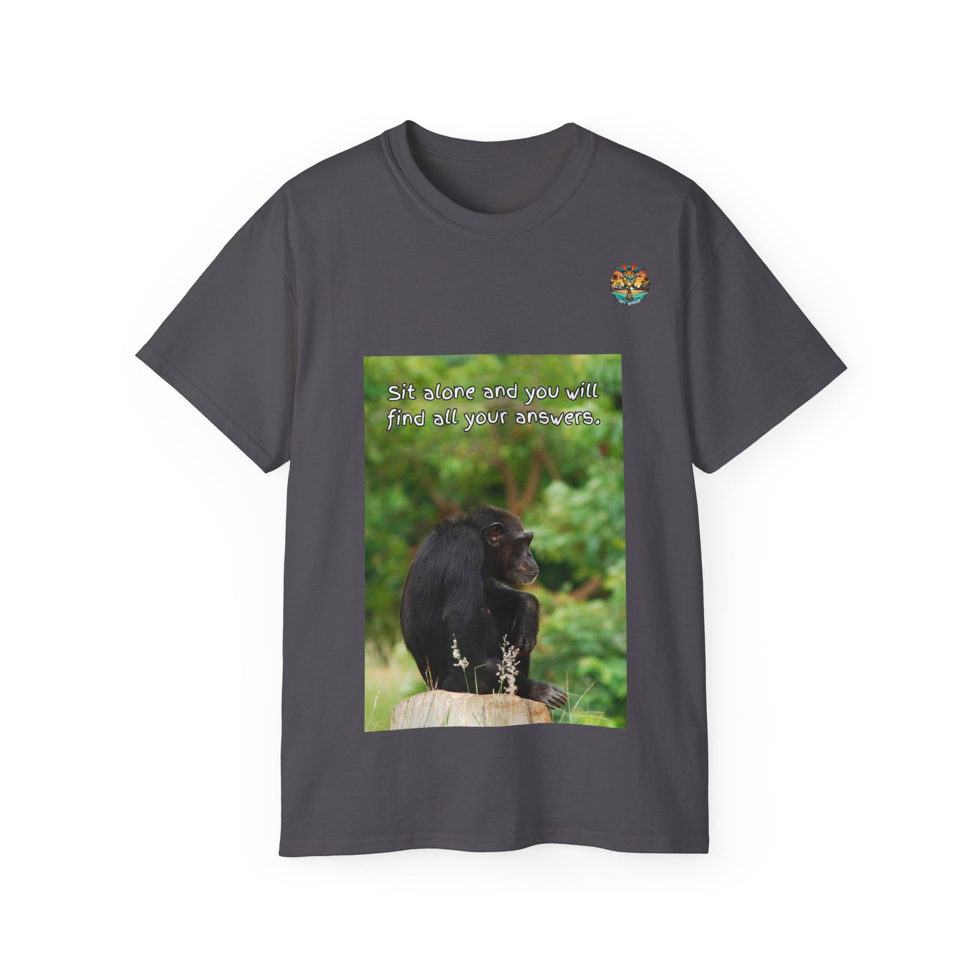 Wer hätte gedacht, dass ein nachdenklicher Affe auf einem Baumstumpf so viel Weisheit ausstrahlen kann? Dieses T-Shirt bringt Ruhe, Humor und Tiefgang zusammen – mit dem inspirierenden Zitat: