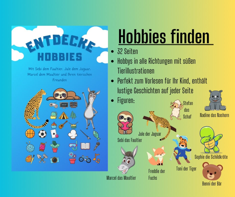 Buch Nummer 1: Begleite Sebi das Faultier, Jule den Jaguar, Marcel das Maultier und ihre tierischen Freunde auf einer spannenden Entdeckungsreise durch die Welt der Hobbies! Von kreativen Aktivitäten bis hin zu sportlichen Abenteuern warten zahlreiche Überraschungen und neue Erlebnisse auf dich. Finde heraus, was dich wirklich begeistert und erlebe unvergessliche Abenteuer mit Sebi und seinen Freunden!